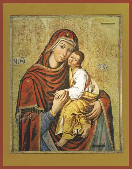 Данный образ относится к типу «Умиление» и из всех видов богородичных икон наиболее тонко передает материнскую нежность и любовь: здесь Младенец Христос и Божия Матерь обнимают друг друга, прильнув щека к щеке, и даже нимбы их сопряжены. Тесные объятия Матери и Сына символизируют не только Материнскую любовь, но и состояние молящейся человеческой души, стремящейся к неразрывной близости с Богом.