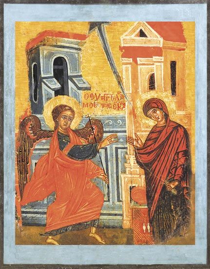 На иконе - радостный момент встречи Архангела Гавриила и Девы Марии. Это одна из уникальных сцен, где Ангел, представитель небесных сил, общается с земной Девой, которая по чистоте своей стала Матерью Спасителя, а затем и самой главной Молитвенницей за каждого из нас. [~DETAIL_TEXT] => Конец 16 века. Греция.