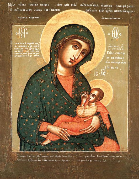Образ «Блаженное чрево» получил свое название по евангельским словам, обращённым к Иисусу Христу: «Блаженно чрево, носившее Тебя, и сосцы, Тебя питавшие» (Лк.11:27). Сказание из сборника начала XVIII века приписывает иконе итальянское происхождение, сообщая, что она в 1392 году была принесена из «Бара града Римския области». Её считали образом стоявшим на гробнице с мощами Николая Чудотворца и почитали сделанной из «чудных разных многих древес». В описях XIX века икона называется «Барловская», что является искажённой формой от «Барградская», то есть происходящая из города Бари. Оригинал иконы находился в Благовещенском соборе до 1924 года, после этого его судьба неизвестна. Сохранилось три списка с оригинальной иконы, одним из которых является икона-пядница — небольшая икона величиною «в пядь»* — написанная в 1664 году иконописцем Иоанном Авксентьевым. Икона имеет надпись, содержащую историю создания иконы и её полностью искажённое наименование — Хабаровская.