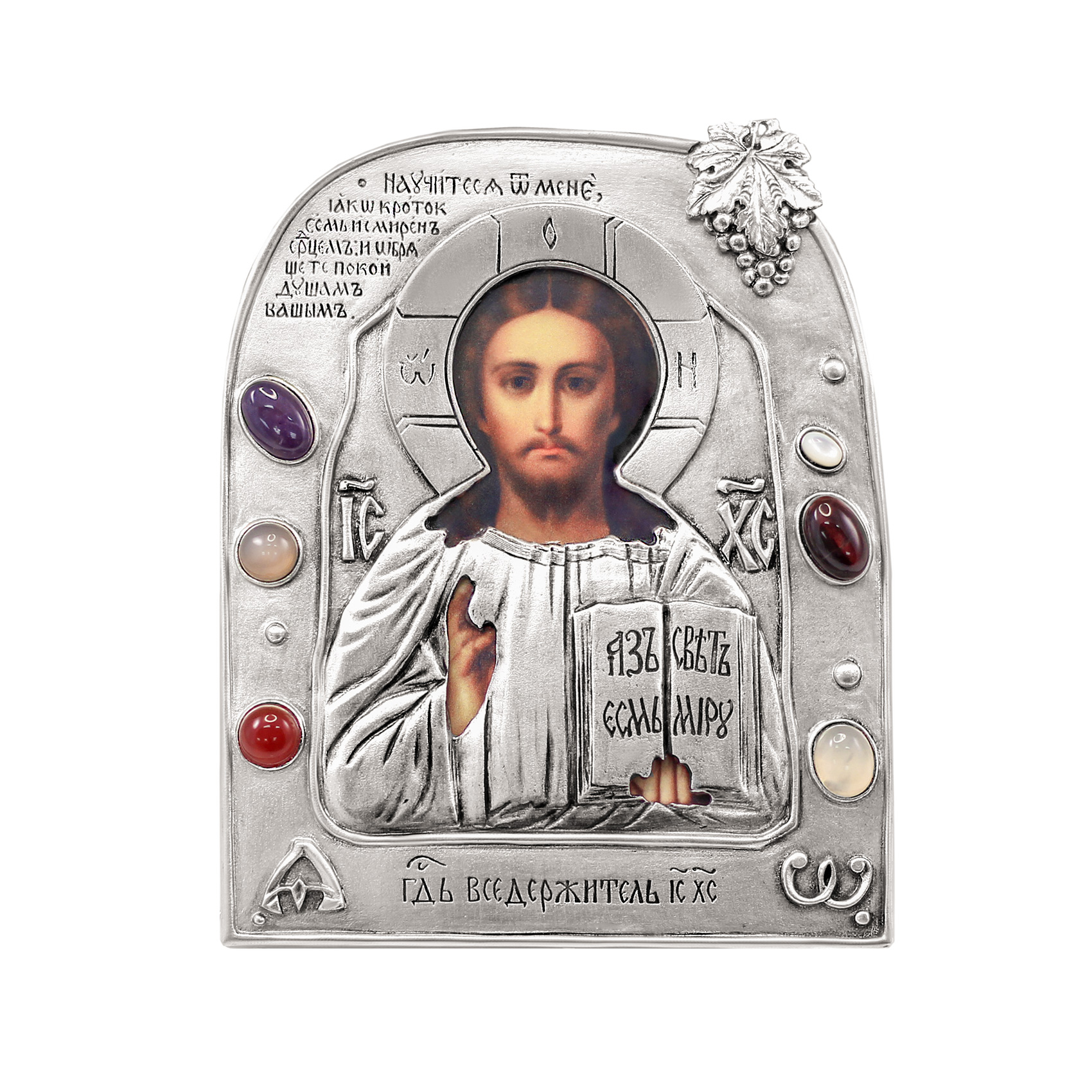 Небольшая икона Спасителя в уникальном авторском гальваническом окладе похожа по дизайну на изделие из музеев византийского искусства. Оклад украшен разноцветными камнями, виноградной лозой и изображением греческих букв альфа и омега, древними христианскими символами.