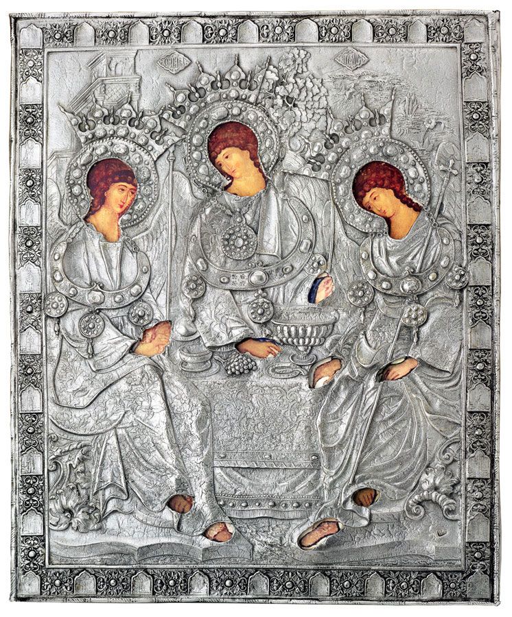На образе «Троица» — Бог Отец, Бог Сын и Святой Дух представлены в виде трех ангелов, сидящих за столом. Образ отражает библейский сюжет, когда праотец Авраам принимал дома трех Путников, посланных Богом, и принесших ему новость о грядущем рождении сына.