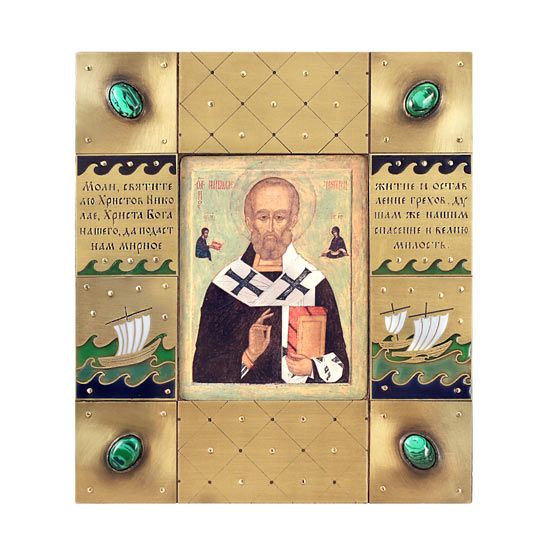 На иконе святитель Николай предстает с Евангелием в руках, являя собой образ проповедника, благовествующего миру Слово Божие. На нем белый с черными крестами омофор — отличительный знак епископского сана. Заметим, что в древности такие омофоры изготавливали из овечьей шерсти. В Евангелии записана притча о заблудшей овце, рассказанная Христом. Добрый Пастырь всегда пойдет на поиски одной потерявшейся овцы, даже если придется на время оставить 99 других, мирно пасущихся. Так и епископ Мир Ликийских прежде всего служил каждому чаду Церкви.