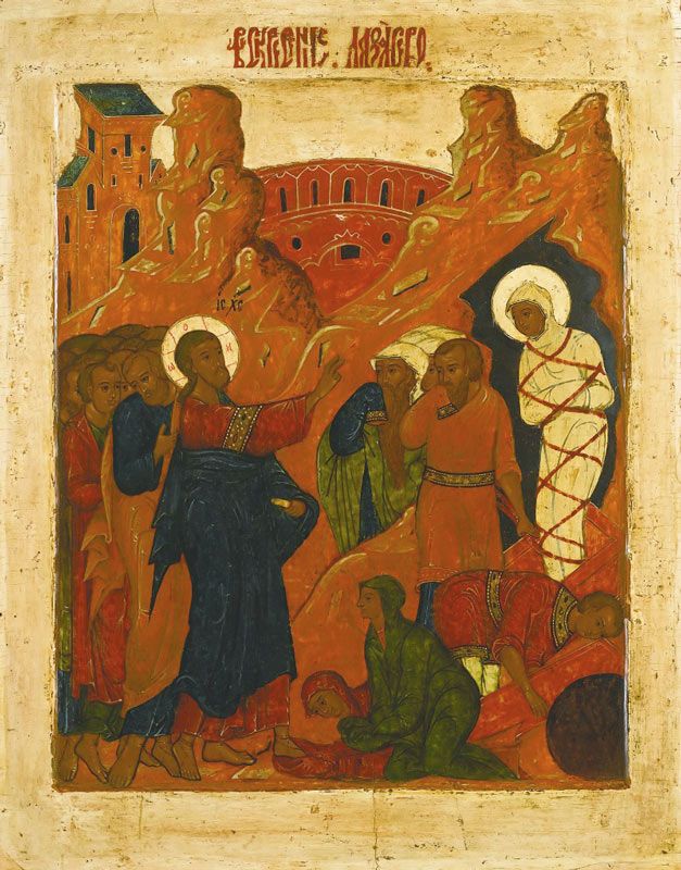 О Воскрешении Лазаря рассказывается в Евангелии от Иоанна (Ин. 11: 1-45). Евангелие повествует, что в Вифании тяжело заболел Лазарь, брат Марии и Марфы. Сестры отправили весть Иисусу о болезни брата, но Господь пришел в Вифанию только через четыре дня после смерти и погребения Лазаря, но пообещал Марфе, вышедшей его встречать, что ее брат воскреснет. Христос в сопровождении апостолов, скорбящих сестер и иудеев отправился к месту погребения Лазаря. Спаситель повелел отвалить камень от пещеры и, возблагодарив Отца Своего, воззвал: «Лазарь, гряди вон!» (Ин. 11: 43). Лазарь вышел к собравшимся обвитый погребальными пеленами, и под влиянием явленного чуда многие иудеи уверовали во Христа.