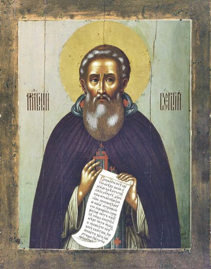 Святой Сергий родился в семье знатных бояр в селе под Ростовом и от рождения получил имя Варфоломей. Варфоломей отставал в учении, несмотря на упорные занятия. Однажды в поле отрок встретил ангела в иноческом обличии. Инок благословил его и дал частицу просфоры и сказал ему: «отныне Бог дает тебе уразуметь грамоту, ты превзойдешь своих братьев и сверстников» (этот момент запечатлен на знаменитой картине Нестерова). В память об этом событии, святому молятся для преодоления трудностей в учебе. После смерти родителей святой удалился в лес для пустынножительства, где поставил келию, а затем и небольшую церковь во имя Святой Троицы. В 1337 году он принял постриг с именем Сергий. Постепенно к его келии стали стекаться иноки, ищущие его руководства. В 1380 году князь Дмитрий Донской пришел в обитель просить у преподобного благословения на сражение с татарами. Святой Сергий дал в помощь князю двух иноков — схимонаха Андрея (Ослябю) и схимонаха Александра (Пересвета) и предсказал победу. В конце жизни святому было явление Пресвятой Богородицы, которая, благословив его, обещала всегда покровительствовать его обители. Преподобный Сергий мирно отошел к Богу 8 октября, а его нетленные мощи до сих пор пребывают в Святой Троице-Сергиевой лавре.