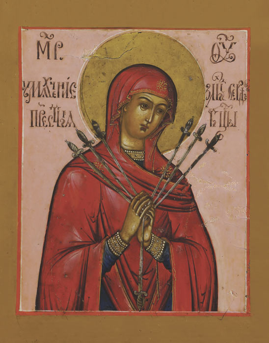 Пречистая «Умягчение злых сердец» пишется с вонзенными в Ее сердце мечами – по три справа и слева, один снизу. Число «семь» в Священном Писании обычно означает полноту, избыточность чего-либо, а в данном случае – полноту и бескрайность того горя, печали и «болезни сердечной», которые испытала Богородица во время Ее земной жизни.