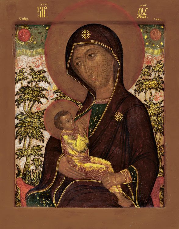 Иконы этой иконографии имеют разные наименования: «Барловская», «Блаженное Чрево» (Лк. 27), «Млекопитательница». Одной из самых почитаемых святынь Московского Кремля была Богоматерь Барловская (XV век), но в России этот сюжет до XVII века был редким. В иконах уже петровского времени он назывался «Блаженное Чрево», согласно подписи на графическом образце – гравюре Григория Тепчегорского (1714 год). В византийской художественной традиции было два извода «Млекопитательницы»: когда изображался Младенец полулежащий и сидящий. На нашей иконе представлен извод, называемый «Барловская», в котором Богоматерь поддерживает обеими руками Богомладенца, полулежащего у нее на коленях.