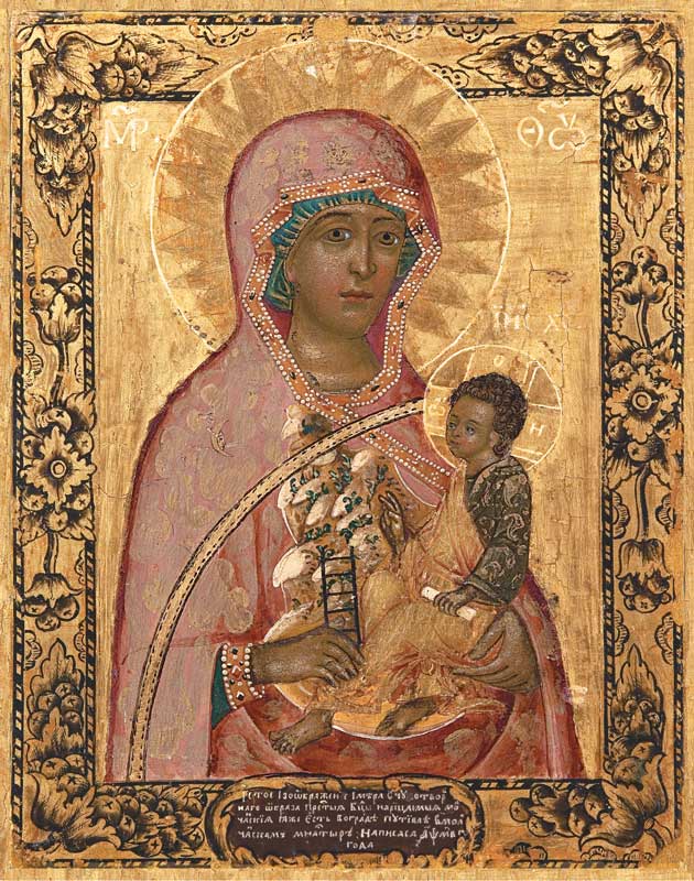 Иконографический извод относится к типу «Одигитрии». Отличительной особенностью иконографии является изображение на мафории облачных разводов, горы, лестницы и радуги. Источниками иконографии являются пророчества и текст Акафиста. Они показывают неразрывную связь между учением о Божией Матери и учением об Иисусе Христе, т.е. спасении рода человеческого через воплощение Сына Божия. Гора связана с толкованием пророком Даниилом сна царя Навуходоносора: камня, оторвавшегося от горы без помощи рук и разбившего истукана (Дан. 2: 27). Оторвавшийся от горы камень – прообраз будущего «бессеменного» рождения Спасителя. Личная святость и величие Богоматери раскрываются в изображенных эпитетах песнопений: «облаче пресветлый», «одушевленная лествица», радуга, вознесенная «превыше небес».