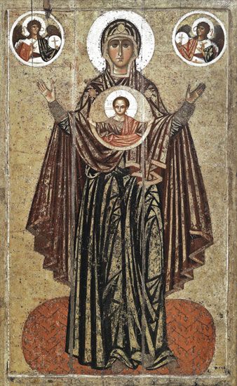 Традиция изображать Богоматерь с воздетыми в молитве руками и Спасом Эмануилом на груди идёт от древнего образа Богородицы из Влахернского храма в Константинополе (ныне Стамбул). Название этого иконографического типа – Великая Панагия.