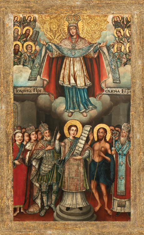 Сюжет иконы праздника основан на тексте «Жития» Андрея Юродивого (IX – X вв.), которому было видение во Влахернской церкви Константинополя, где хранилась священная реликвия – риза Богоматери. Богородица явилась на воздухе «с пророками, апостолами и чинами ангельскими» и в знак покровительства простерла над молящимися свой покров. Вероятно, на сложение праздника и формирование иконографии оказал влияние и еженедельно совершавшийся во Влахернском храме обряд, во время которого над образом Богоматери поднимался особый покров. Еще одним источником иконографии явилось «Житие» Романа Сладкопевца, великого гимнографа первой половины VI века, который изображен на амвоне. На иконе Богоматерь изображена в виде Оранты. Действие происходит на фоне интерьера храма. Внизу справа изображен Андрей Юродивый, указывающий на чудесное явление Богородицы. К середине XVIII века в белорусской иконописи четко очерчивается направление, которое стремится соединить в иконографии характерные католические и православные признаки, придав ей формы барочного стиля. Одним из его представителей был монограммист М. В. Известно, что белорусские художники XVI–XVIII вв., как правило, не подписывали свои произведения, а часто ставили только монограммы (переплетения начальных букв имени и фамилии, образующими знак или узор). Наряду с использованием гравюры в качестве образца вводятся портретные изображения современных правителей, иерархов, донаторов, что особенно широко встречается в украинских композициях Покрова различных иконографических вариантов, причем в различных регионах.