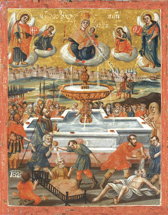 В V веке в Константинополе, близ так называемых «Золотых ворот», находилась роща, посвященная Пресвятой Богородице. В роще был источник, с давних пор прославленный чудесами. Постепенно это место заросло кустарником, а воду затянуло тиной.