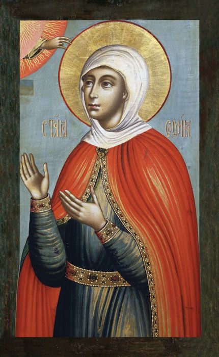 Во втором веке, в правление императора Адриана, ярого гонителя христиан, в Риме жила благочестивая вдова София (имя София значит «премудрость»). У нее были три дочери, носившие имена главных христианских добродетелей: Вера, Надежда и Любовь. Будучи глубоко верующей сама, она воспитала своих дочерей в любви к Богу и готовности отказаться от всего земного ради Него. Слух о благочестивой семье дошел до самого императора, и он пожелал лично увидеть их. Удивившись их бесстрашному исповеданию Истинного Бога, он поручил одной язычнице научить детей языческой вере. Все усилия его оказались тщетны, вера их осталась непоколебимой. Тогда император велел придать детей мучениям. Их избивали, клали на раскаленную решетку, окунали в кипящую смолу, но мучения почти не приносили вреда отроковицам. Ничего не добившись, их усекли мечом. Мать мучениц, Софию, не стали подвергать пыткам физическим, но обрекли ее на еще более сильные душевные мучения разлуки с детьми. Страдалица похоронила останки дочерей и два дня оставалась на их могиле, пока Господь не забрал и её душу к себе. Так нам явилась великая духовная сила мучеников, которые по своей пламенной вере были укрепляемы благодатью Святого Духа и через мучения стяжали себе венцы в Царствии Небесном.