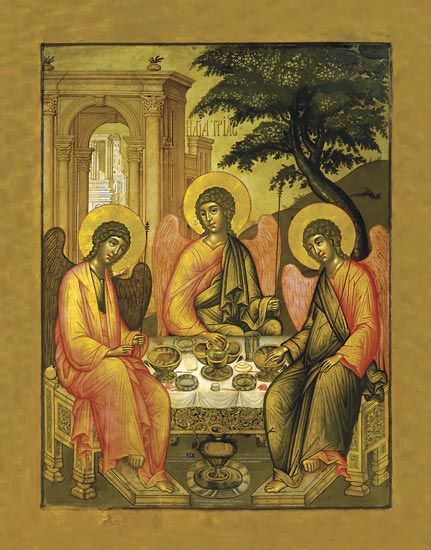 Новый Евхаристический смысл вдохнул в эту икону русский иконописец св. Андрей Рублев. На его иконе перед Ангелами стоит одна только чаша, и эта чаша – символ жертвы Христа за наши грехи. Иконописец изобразил Ангелов как три ипостаси Божии. Одинаковый внешний вид Ликов показывает, что Господь есть Святая Троица – единое и неделимое Целое.