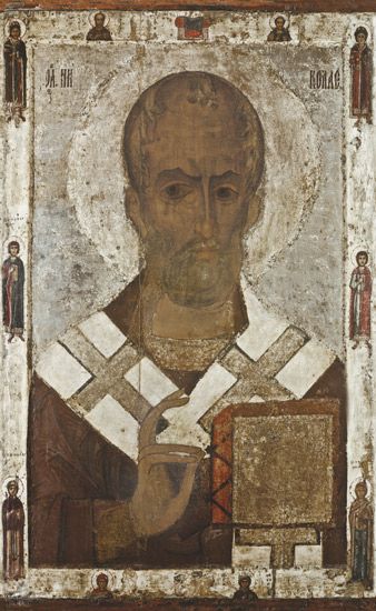 На иконе святитель Николай предстает с Евангелием в руках, являя собой образ проповедника, благовествующего миру Слово Божие. На нем белый с крестами омофор — отличительный знак епископского сана. Заметим, что в древности такие омофоры изготавливали из овечьей шерсти. В Евангелии записана притча о заблудшей овце, рассказанная Христом. Добрый Пастырь всегда пойдет на поиски одной потерявшейся овцы, даже если придется на время оставить 99 других, мирно пасущихся. Так и епископ Мир Ликийских прежде всего служил каждому чаду Церкви.