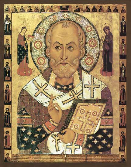 На иконе святитель Николай предстает с Евангелием в руках, являя собой образ проповедника, благовествующего миру Слово Божие. На нем белый с черными крестами омофор — отличительный знак епископского сана. Заметим, что в древности такие омофоры изготавливали из овечьей шерсти. В Евангелии записана притча о заблудшей овце, рассказанная Христом. Добрый Пастырь всегда пойдет на поиски одной потерявшейся овцы, даже если придется на время оставить 99 других, мирно пасущихся. Так и епископ Мир Ликийских прежде всего служил каждому чаду Церкви.