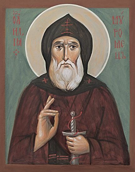 Преподобный Илия Муромец жил в XII веке. Очень мало достоверных сведений сохранилось о его житии. Происходил он из простой крестьянской семьи. Всё своё детство и юность Илья был болен, у него был паралич, однако чудесным образом он был исцелен. Предание сохранило сведения о том, что он состоял в княжеской дружине и прославился воинскими подвигами, а также большой физической силой. В какой-то момент своей жизни Илия принял решение оставить воинскую службу и принять монашество в Киево-Печерском монастыре, где и скончался иноком около 1188 года.