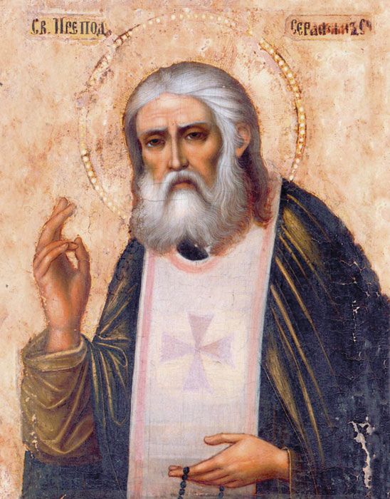 Преподобный Серафим (в миру Прохор) родился в 1754 году в Курске. В 24 года он ушел в Саровский монастырь, а затем удалился в лес, где вел отшельническую жизнь почти 40 лет. На образе святой изображен молящимся на камне пред иконою Божией Матери «Умиление». Этот подвиг он совершал 1000 дней и ночей подряд. В 1825 году святому явилась Божья Матерь и повелела ему выйти из затвора и принимать людей, нуждающихся в помощи. «Христос Воскресе, радость моя» – этими словами святой встречал каждого приходящего к нему человека, в независимости от его возраста и социального положения. Святой Серафим предсказал кровавые события после 1917 года, гонение на веру и последующее возрождение России. 2-го января святой преставился во время молитвы, стоя на коленях пред образом своей любимой иконы Божьей Матери «Умиление».