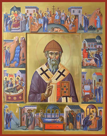 Святитель Спиридон Тримифунтскии родился в конце III века на острове Кипр. О его жизни сведений сохранилось мало. Известно, что он был пастухом, имел жену и детей. Все свои средства он отдавал на нужды ближних и странников, за это Господь вознаградил его даром чудотворения: он исцелял неизлечимо больных и изгонял бесов. После смерти жены, в царствование императора Константина, его рукоположили во епископа Кипрского города Тримифунта. В сане епископа святитель не изменил своего образа жизни, соединив пастырское служение с делами милосердия.