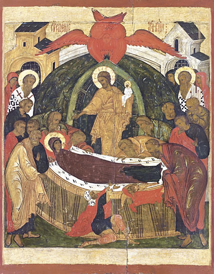 И настал час, когда должно было совершиться Успение Божией Матери. Пылало множество свечей. Святые апостолы с песнопениями окружали благолепно украшенный одр, на котором возлежала Богородица. Она молилась в ожидании Своего исхода и пришествия Своего вожделенного Сына и Господа. Внезапно заблистал неизреченный свет Божественной Славы, пред которым померкли пылавшие свечи. Верх помещения как бы исчез в лучах необъяснимого света, и сошел Сам Царь Славы – Христос, окруженный множеством ангелов, архангелов и других небесных сил с праведными душами праотцев и пророков, некогда предвозвещавших о Пресвятой Деве. Без всякого телесного страдания, как бы в приятном сне, Пресвятая Дева предала душу в руки Своего Сына и Бога.