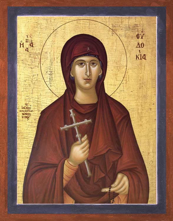 Святая преподобномученица Евдокия была самарянкой, родом из города Илиополя Финикии Ливанской. Языческая вере оттолкнула ее от доброго пути, и она долго вела греховную жизнь. Однажды в полночь Евдокия проснулась и услышала за стеной, в другой половине дома, где жил старец-христианин, молебное пение и чтение Священного Писания, в котором говорилось и о вечном блаженстве, уготованном праведникам, и о возмездии, ожидающем грешников. Благодать Божия коснулась сердца Евдокии, и она осознала, что это совершенные ею грехи лежат тяжестью на ее душе. Старец Герман, чьи молитвы так пришлись по душе Евдокию, не оттолкнул грешницу, и святая приняла крещение. Раздав все свое имущество нищим, она удалилась в монастырь и приняла на себя самые строгие подвиги покаяния. Господь простил покаявшуюся грешницу и наделил ее благодатными духовными дарами.