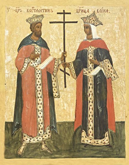 Святой император Константин и его мать святая царица Елена изображены с большим крестом, так как им принадлежит заслуга обретения того самого Животворящего Креста, на Котором почти за три столетия до них совершил дело нашего спасения Христос. Крест был чудесным образом обретен в 326 году царицей Еленой в Иерусалиме, куда ее направил император Константин, дав ей большие полномочия и материальные средства. Кроме того в святой Елене видит верную молитвенницу и ходатаицу каждая православная мать – ведь именно святая Елена стала матерью первого римского императора-христианина, который оставил язычество, положил предел трехвековым гонениям на Церковь и явил первый в истории пример христианского государя, что изменило ход всей мировой истории.