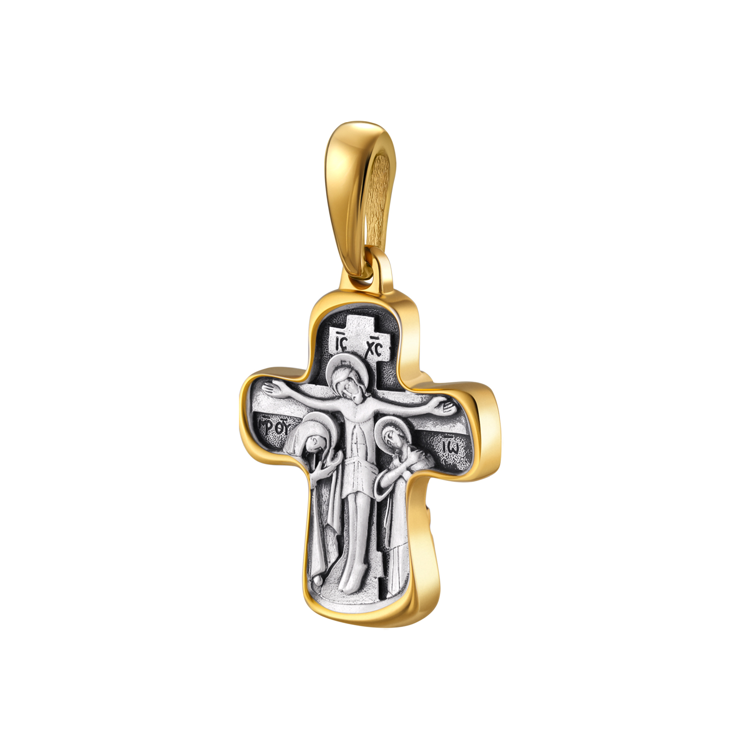 Распятый Христос запечатлен на изделии словно парящим в воздухе. Он распростёр Свои объятия и ждет, когда мы откликнемся на Его любовь. Спасителю предстоят в молитве Богородица и апостол Иоанн Богослов.
