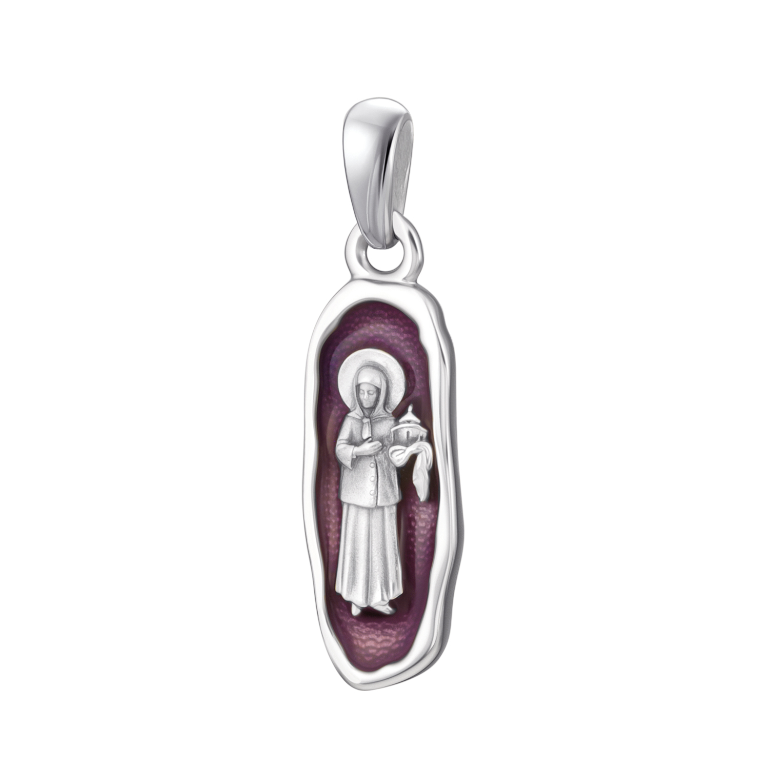 Из самых разных уголков России и мира верующие приезжают поклониться Матронушке в Покровский монастырь в Москве и ощущают на себе ее помощь. Именно Покровский храм блаженная держит на этой подвеске. Правую же руку прижала к сердцу в знак непрестанной сердечной молитвы за всех обращающихся к ней.