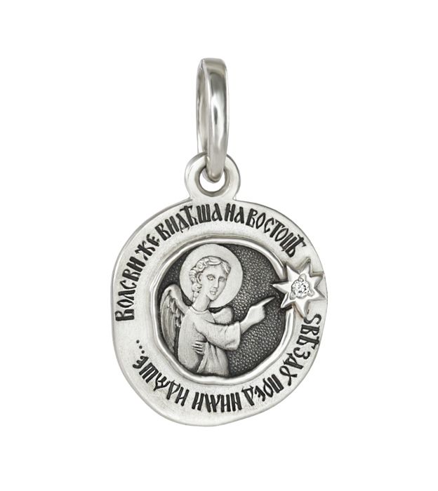 На оборотной стороне на сверкающем круге изображение Рождественской звезды. Художественное решение изделия оригинально, современно, ювелиры использовали новые технические приемы, форму, блестяще сочетая разные фактуры, цвета драгоценного металла.