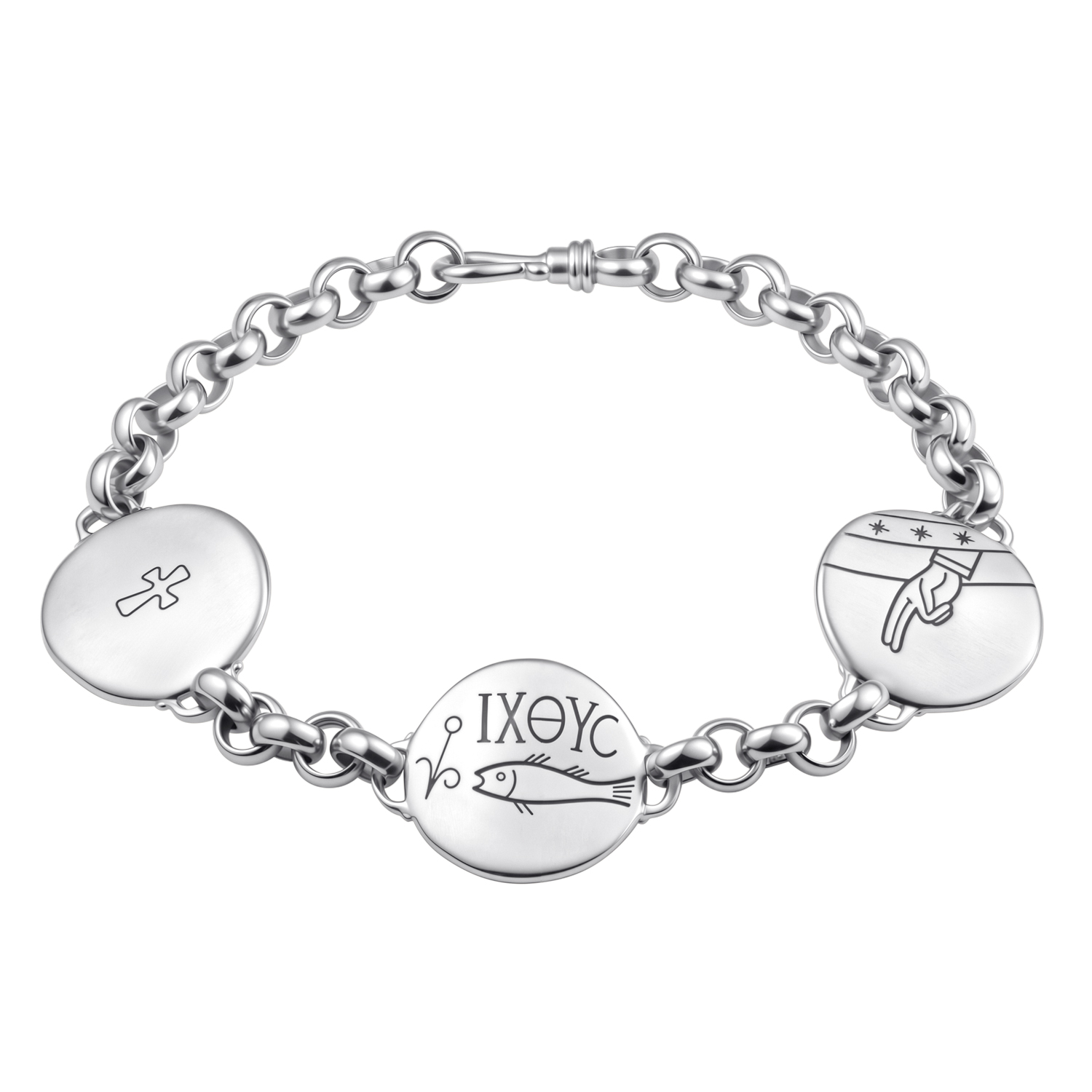[~DETAIL_TEXT] => Крупная цепь соединяет три круглых плоских элемента с изображениями христианских символов: креста, рыбы и десницы.Крест – главный символ христианства, он обязательно присутствует в христианских храмах, а также у верующих на груди, он является щитом и оружием, памятником победы над дьяволом.