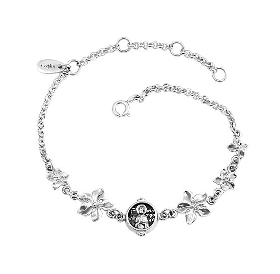 Серебряный с чернением браслет состоит из звеньев-цветов, а на центральном элементе - образок святой Матроны Московской.