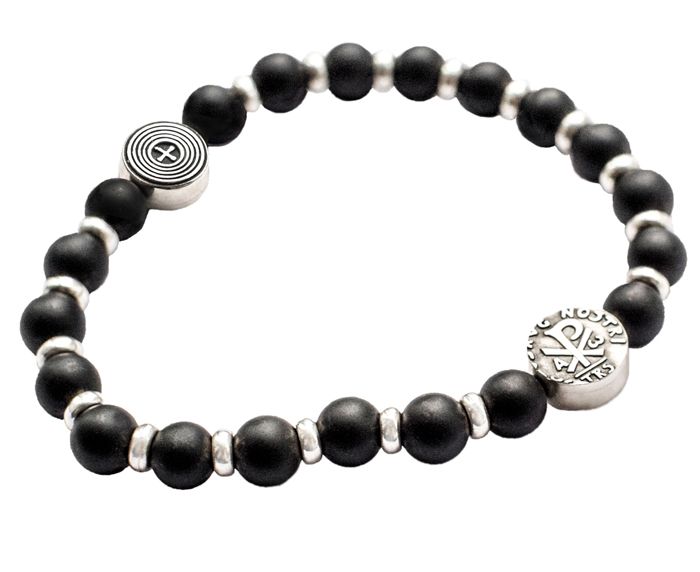 Четки - браслет состоят из 20 бусин из камня агат, между которыми гладкие серебряные кольца. Две круглые плоские бусины украшены древним сакральным знаком монограммой Хризмой, которая означает Христа как Помазанника Божьего, Мессию. Этот символ с древности прочно вошел в христианский изобразительный язык. Оборотная сторона декорирована узкими полосами, в центре — изображение креста.