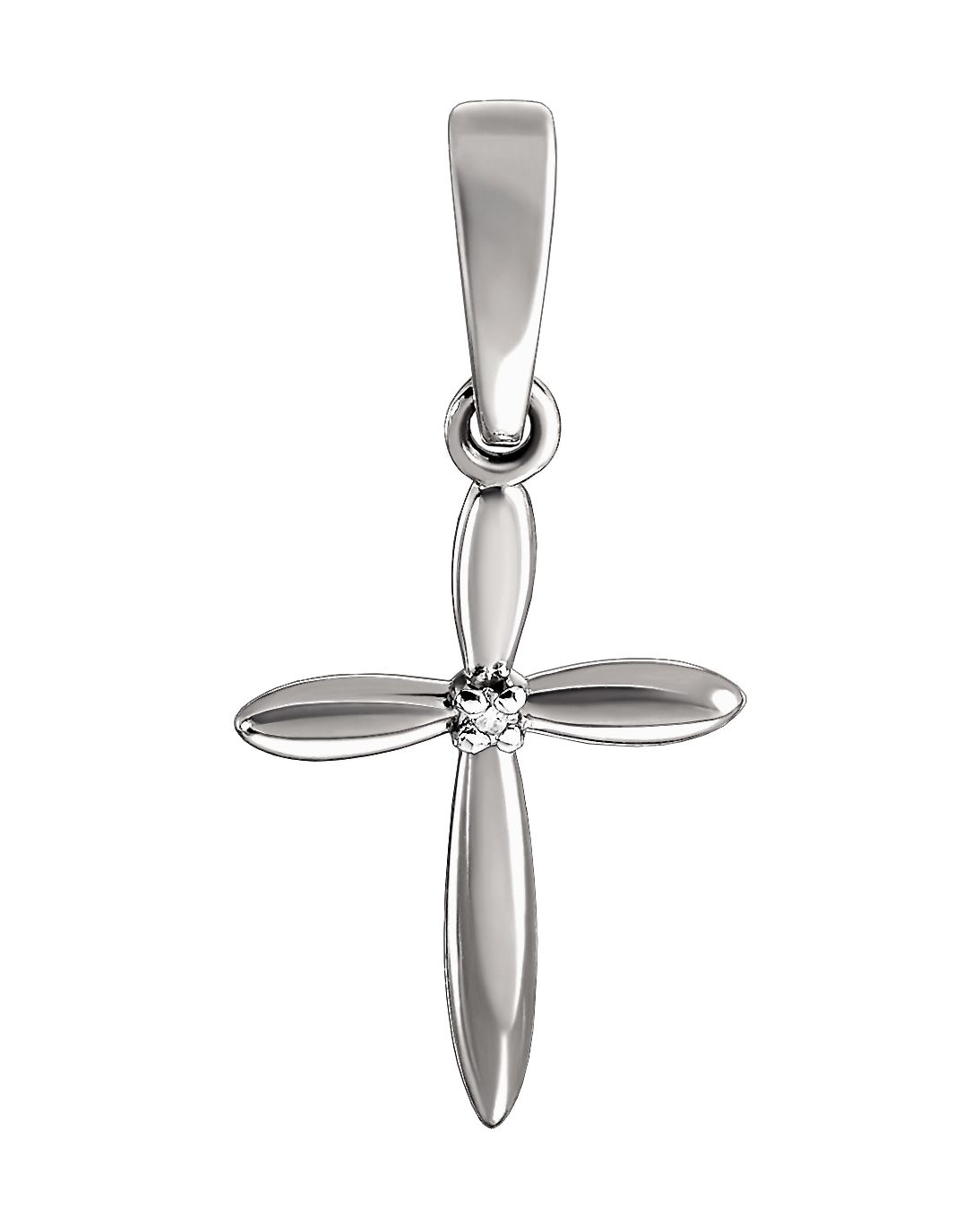 Лаконичный крест похожий на цветок, украшенный бриллиантом. Крест соответствует православным канонам и освящен.