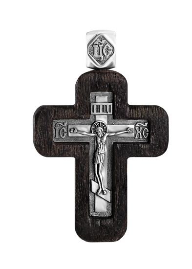 Этот крест выполнен из драгоценного эбенового (черного) дерева, а внутренний крестик с распятием, петля и элемент с молитвой на спинке изделия изготовлены из серебра 925 пробы.