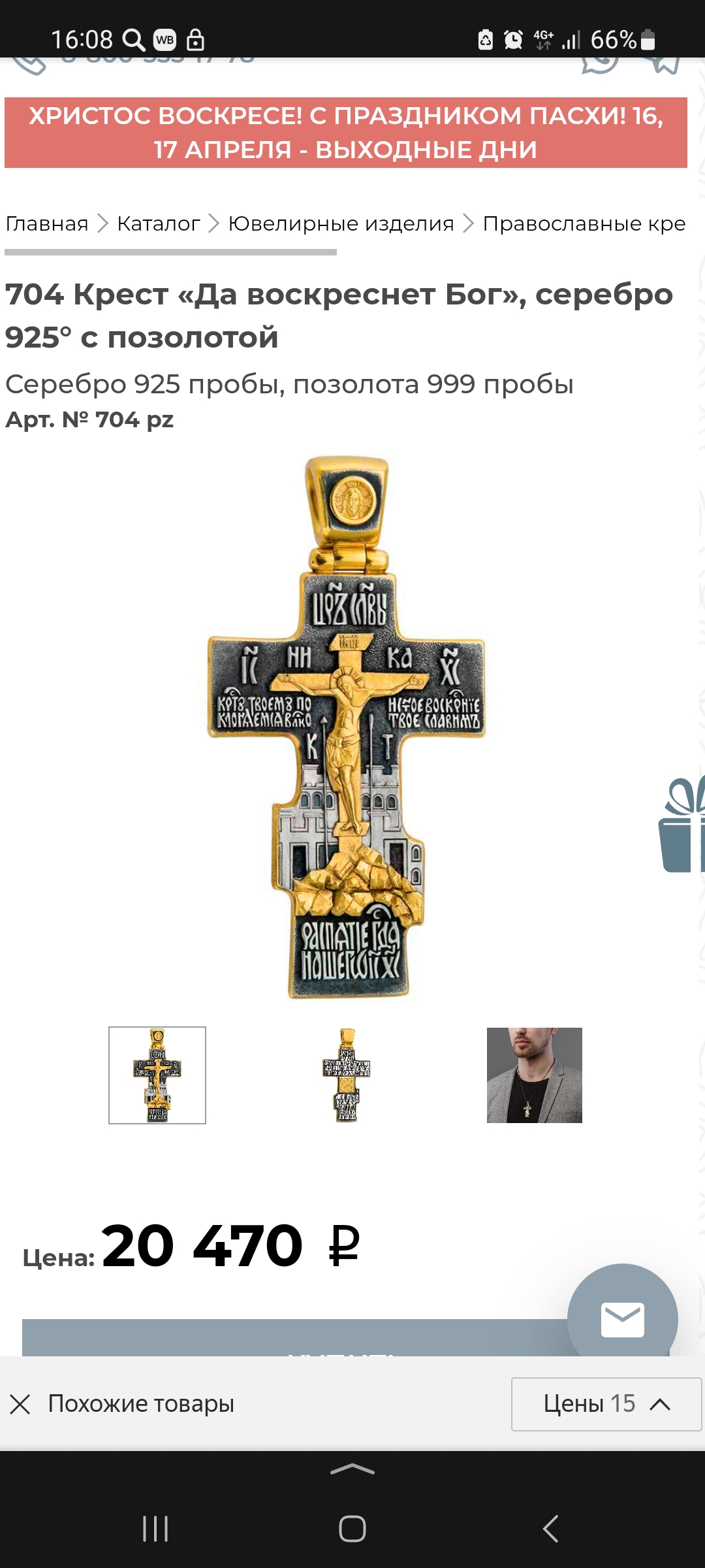 Крест выпускается в двух вариантах - серебре и серебре с позолотой. Подробности уточняйте, пожалуйста, у оператора при заказе.