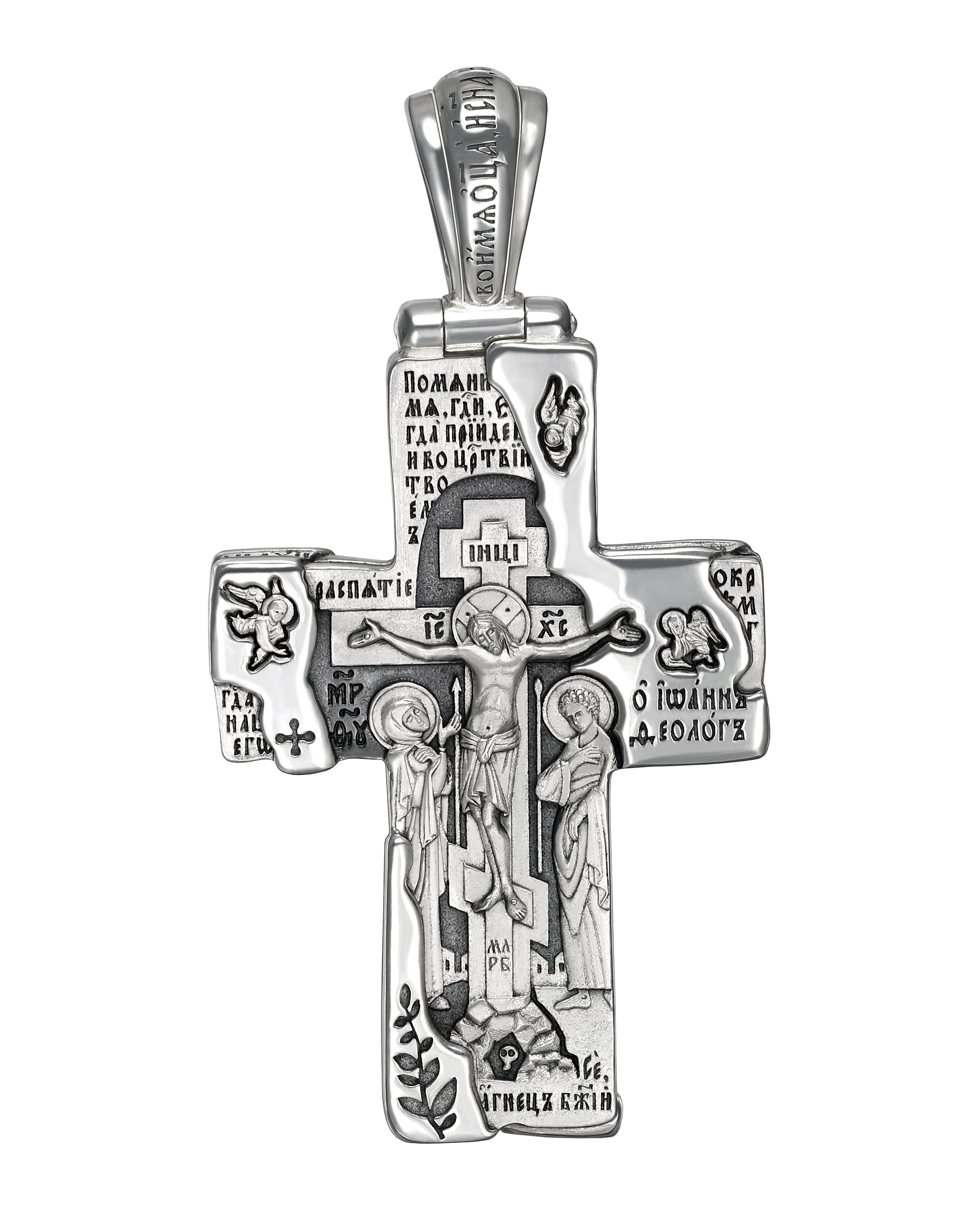 На лицевой стороне креста слова молитвы: Помяни мя Господи, егда приидеши во Царствии Твоем Распятие господа Нашего се Агнец Божий вземляй грехи мира.