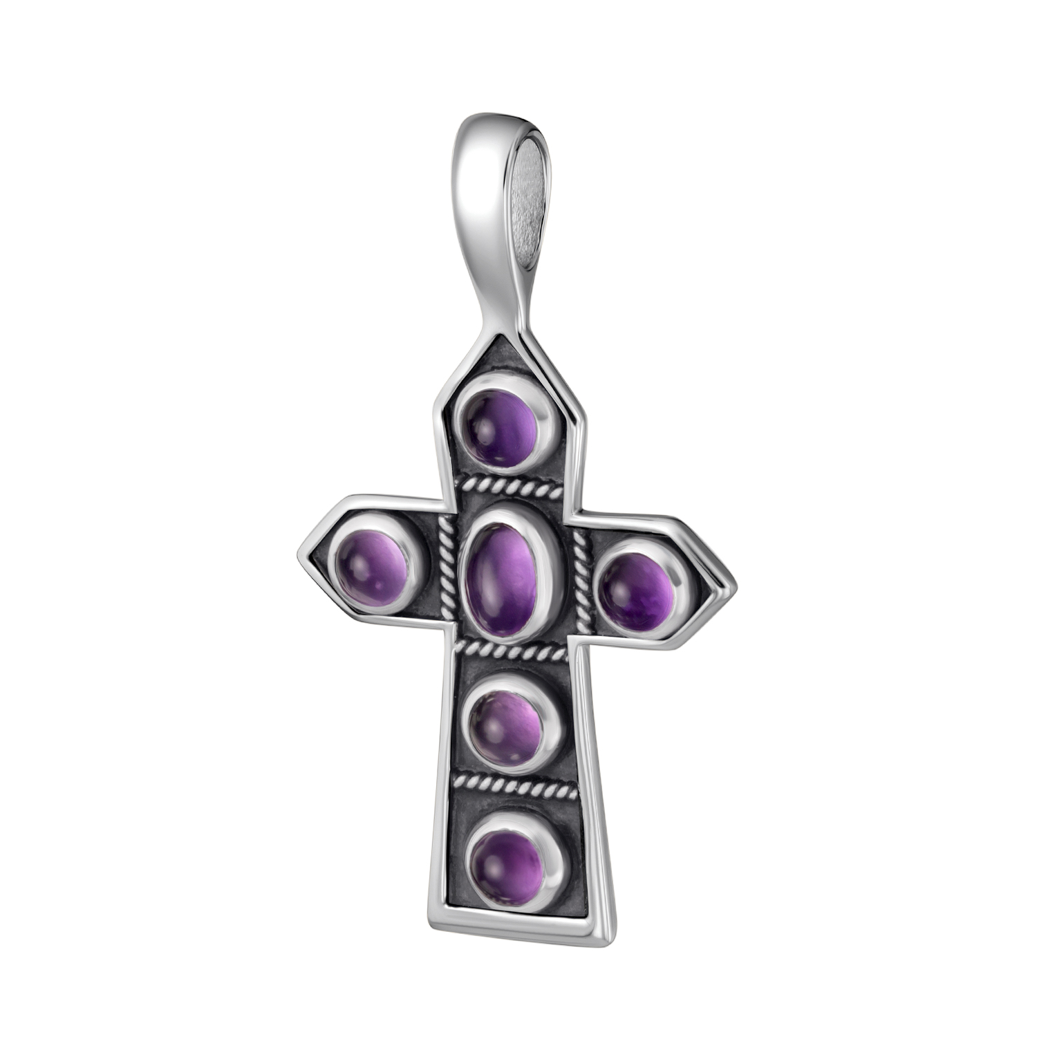 [~DETAIL_TEXT] => Сужающиеся лучи креста традиционно делали на женских крестах. Несмотря на богатый декор — шесть выпуклых камней (гранаты или аметисты) и скань — крест этот очень строгий. Он полностью чужд малейшего намека на роскошь. Скорее эти камни напомнят о крови, пролитой Христом ради нашего спасения.