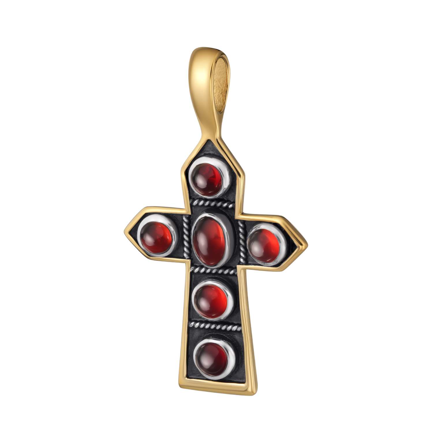 [~DETAIL_TEXT] => Сужающиеся лучи креста традиционно делали на женских крестах. Несмотря на богатый декор — шесть выпуклых гранатов и скань — крест этот очень строгий. Он полностью чужд малейшего намека на роскошь. Скорее эти камни напомнят о крови, пролитой Христом ради нашего спасения.