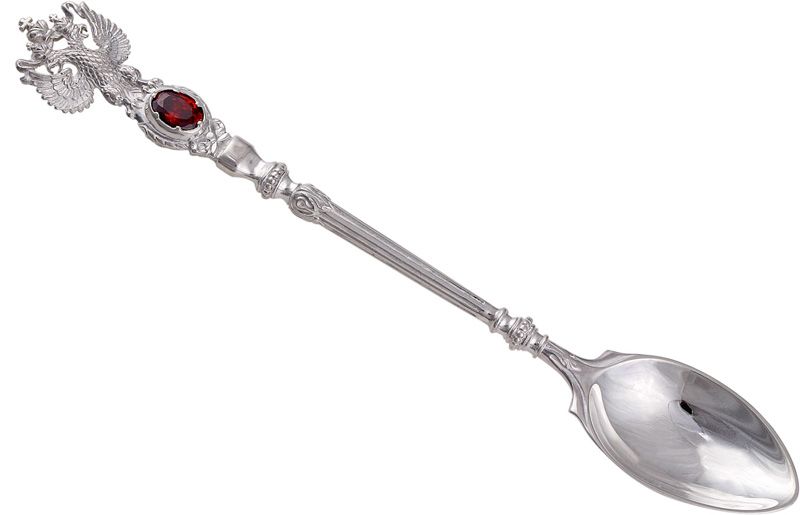 [~DETAIL_TEXT] =>Герб, изображенный на ложке, является осмыслением исторического предназначения нашего народа. Две увенчанные головы орла символизируют единство духовной и светской власти, власти патриарха и царя над русской землей. Наверху в центре располагается третий венец, знаменующий собой власть Бога над Россией. Одна голова орла обращена на Запад, а другая на Восток, символизируя срединное положение России. Вензель на обратной стороне – инициалы императрицы Екатерины.Ложка может стать прекрасным именным подарком, или просто гармонично дополнить даже самый ценный сервиз. В России существовала традиция дарить новорожденному серебряную ложку, когда у него прорезается первый зуб. И сейчас эта традиция по-прежнему остаётся актуальной. Первый зуб, как правило, совпадает по времени с тем моментом, когда грудному младенцу начинают давать помимо молока матери и другую мягкую пищу. Размер детской ложки позволяет кормить с неё младенца, а ионы серебра обладают обеззараживающим действием.