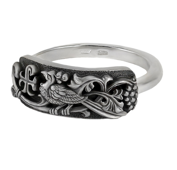[~DETAIL_TEXT] => Щиток кольца украшен христианскими символами, исполненные тонким, красивого рисунка рельефом на патинированном фоне. Изображения Хризмы - монограммы Спасителя, «Печати Бога Живаго», павлина – символа бессмертия, виноградной лозы – символа Евхаристии, которые через художественные образы передают христианское богословие, защищают, хранят, помогают в спасении.