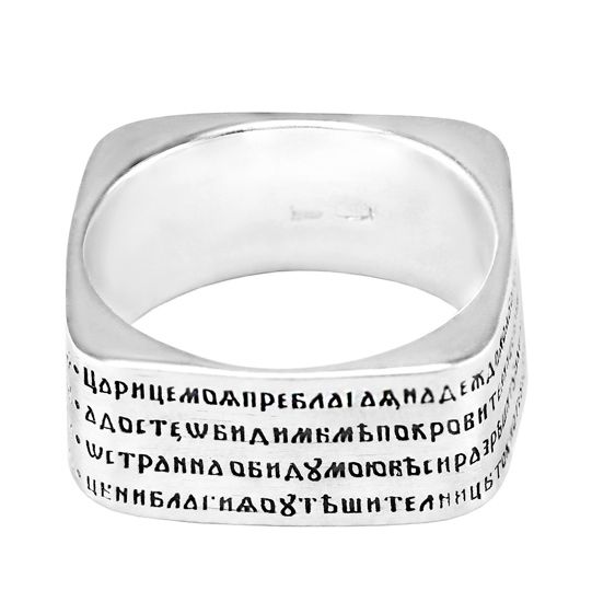 Это кольцо – очень необычное внешне, и оно неизменно привлекает внимание покупателей. Круглое внутри, и почти квадратное снаружи, оно прекрасно смотрится как на мужской, так и на женской руке и очень удобно в ношении. Поверхность кольца покрыта резной молитвой к Богородице «Царице моя Преблагая…», это молитва к Божией Матери, исходящая из самой глубины сердца верующего. Когда она поётся в храме, многие встают на колени.
