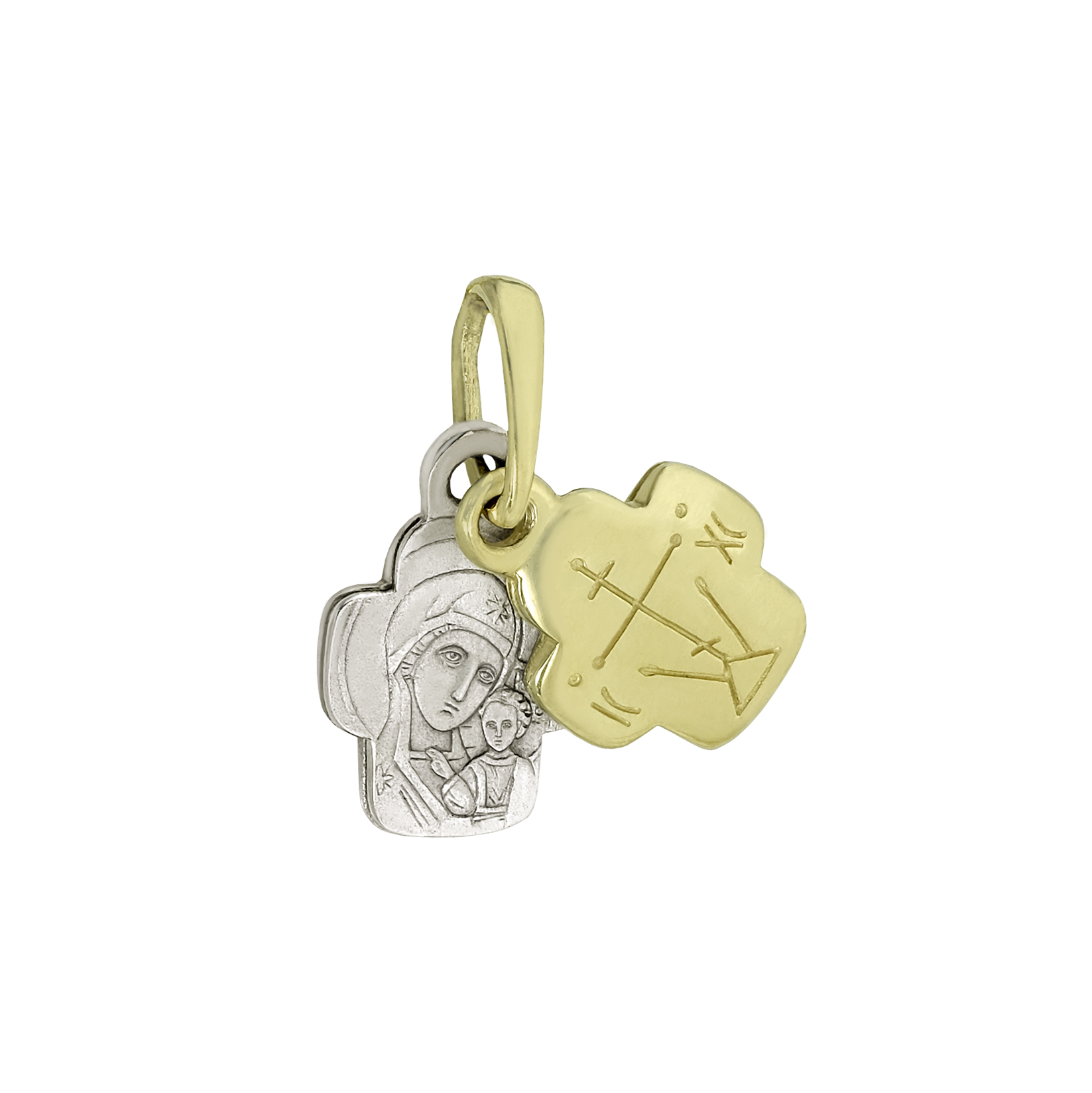 Этот миниатюрный каноничный крестик необычен тем, что на одну петельку крепятся две подвески. Лицевая - с крестиком, и вторая - с ликами Богородицы и Богомладенца.