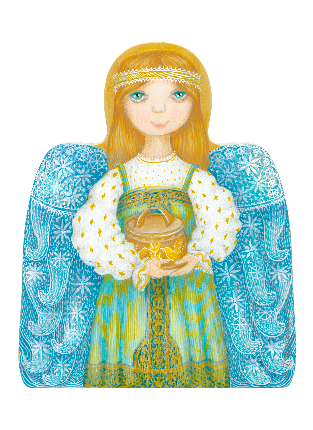 Крылья Олёнки сотканы из знаменитого на весь мир Вологодского кружева, а ее одежда такая же, какую носили Вологодские красавицы. На голове ангельской девушки венок из бересты, а в руках круглая берестяная коробочка с росписью — туесок. Он отсылает нас к традиционному ремеслу Вологодского края — плетения из бересты, резьбы и росписи по ней. Может в туеске то самое Вологодское масло?