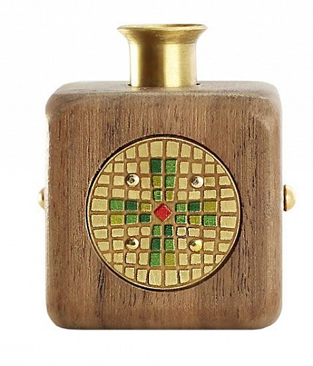 Латунный держатель для свечи встроен сверху, выступает над поверхностью деревянной основы-куба, напоминает по форме и цвету церковные подсвечники.